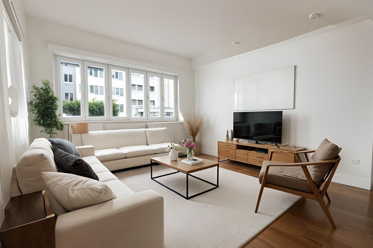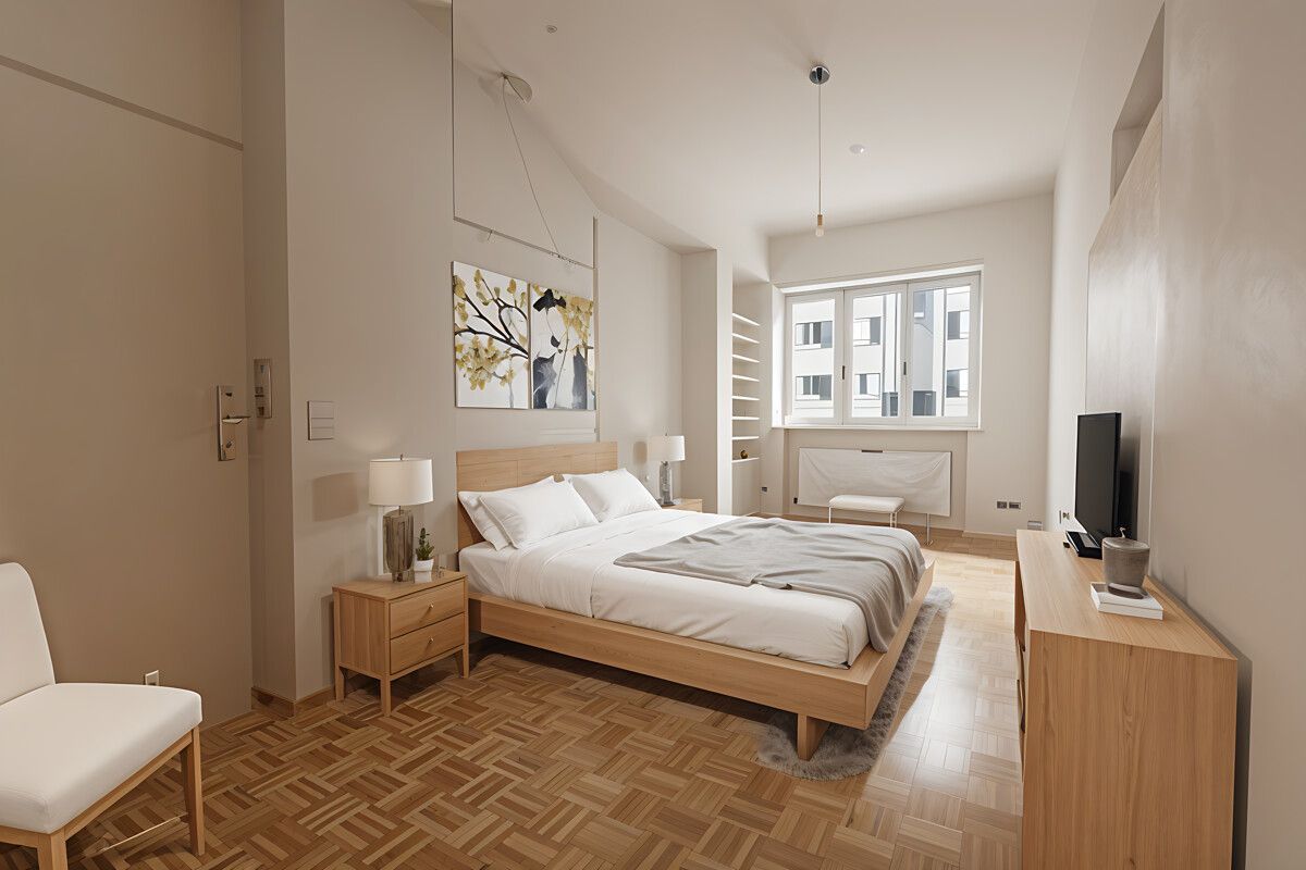 Auf der linken Seite der Wohnung liegt das gemütliche Schlafzimmer, das ausreichend Platz für ein großes Bett und einen Einbau-Kleiderschrank bietet. Daneben befindet sich das helle und freundliche Wohnzimmer, das viel Raum für individuelle Einrichtungsideen lässt.