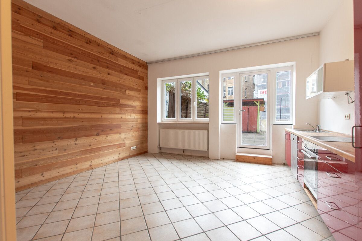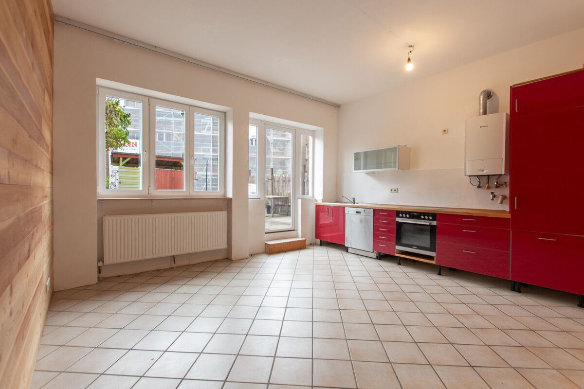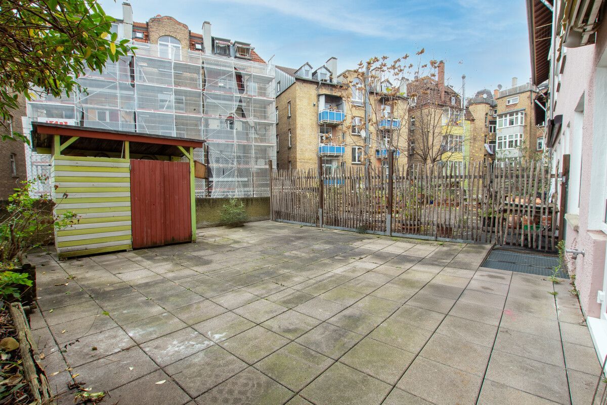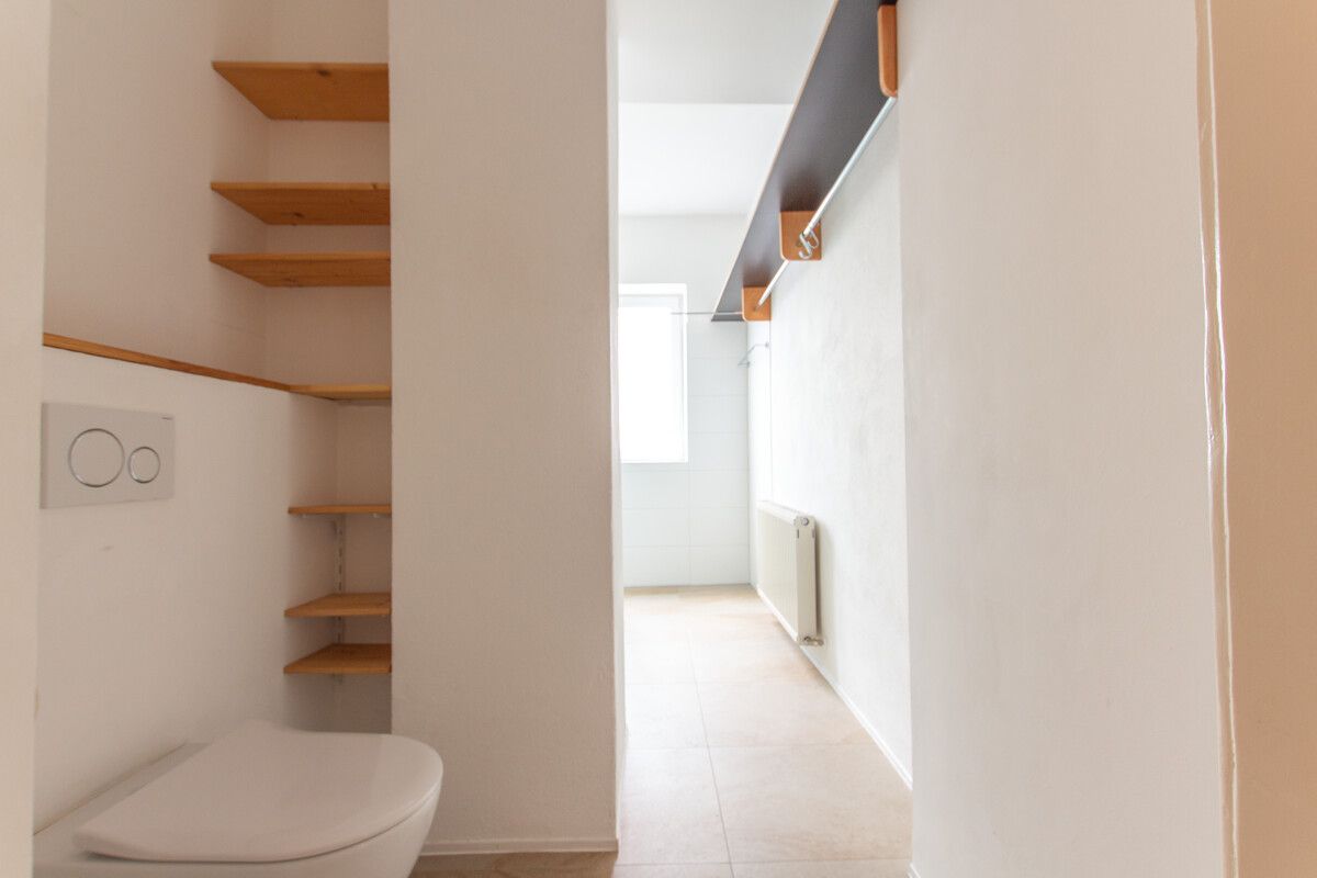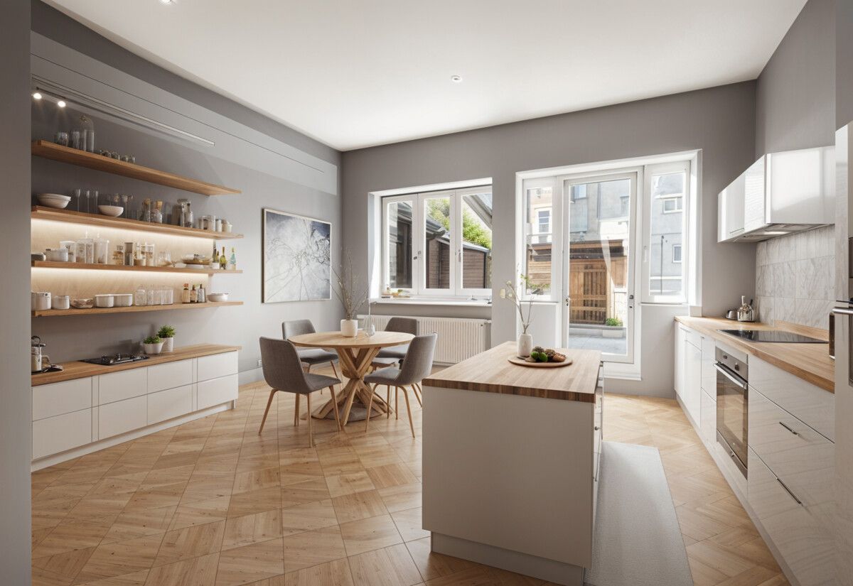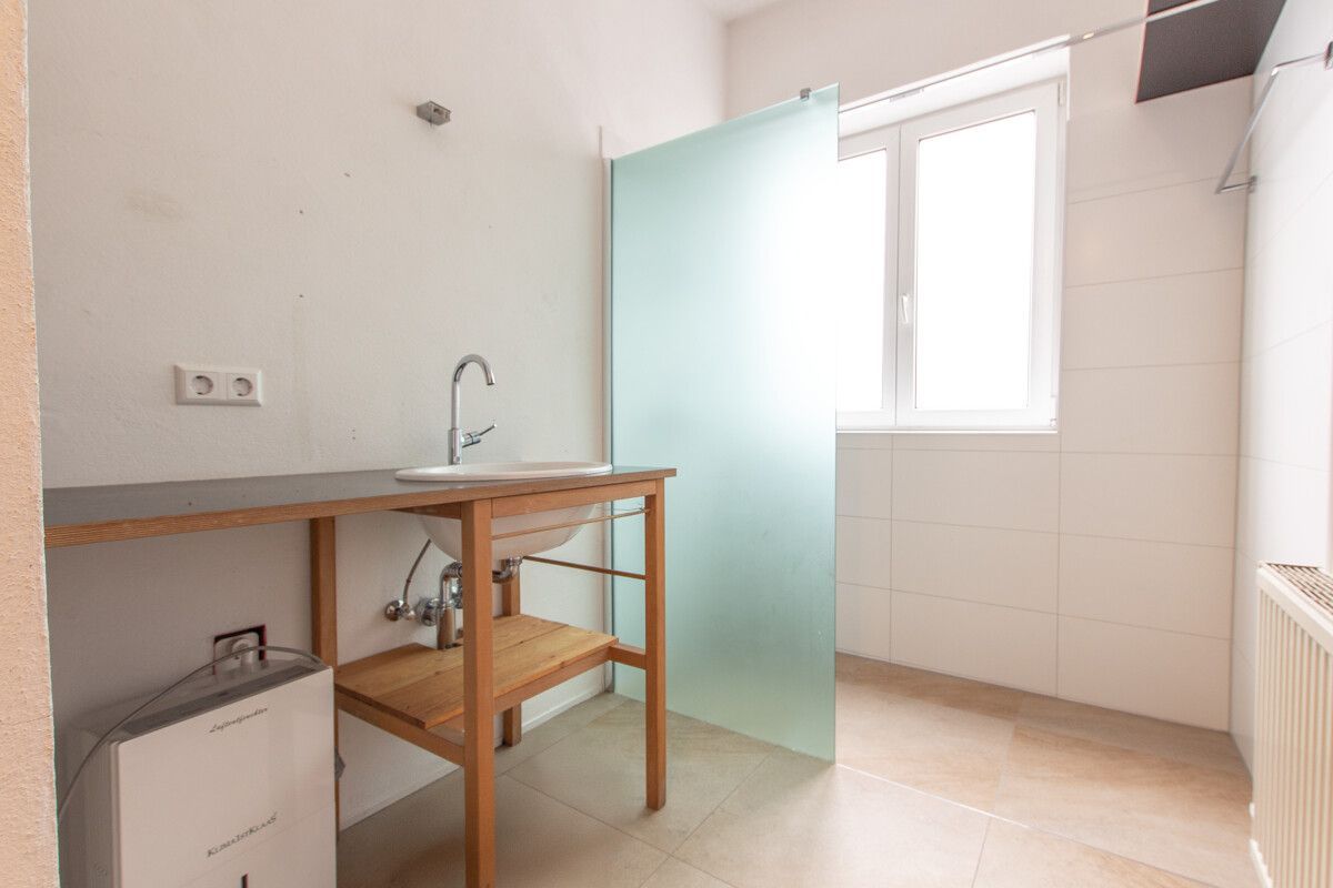 Rechterhand befinden sich das moderne Badezimmer und die Küche. Die geräumige Wohnküche ist ein echtes Highlight – hier haben Sie nicht nur ausreichend Platz zum Kochen und Essen, sondern auch direkten Zugang zur großen Terrasse im ruhigen Hinterhof. Diese lädt zum Entspannen, Gärtnern oder geselligen Abenden mit Freunden ein.