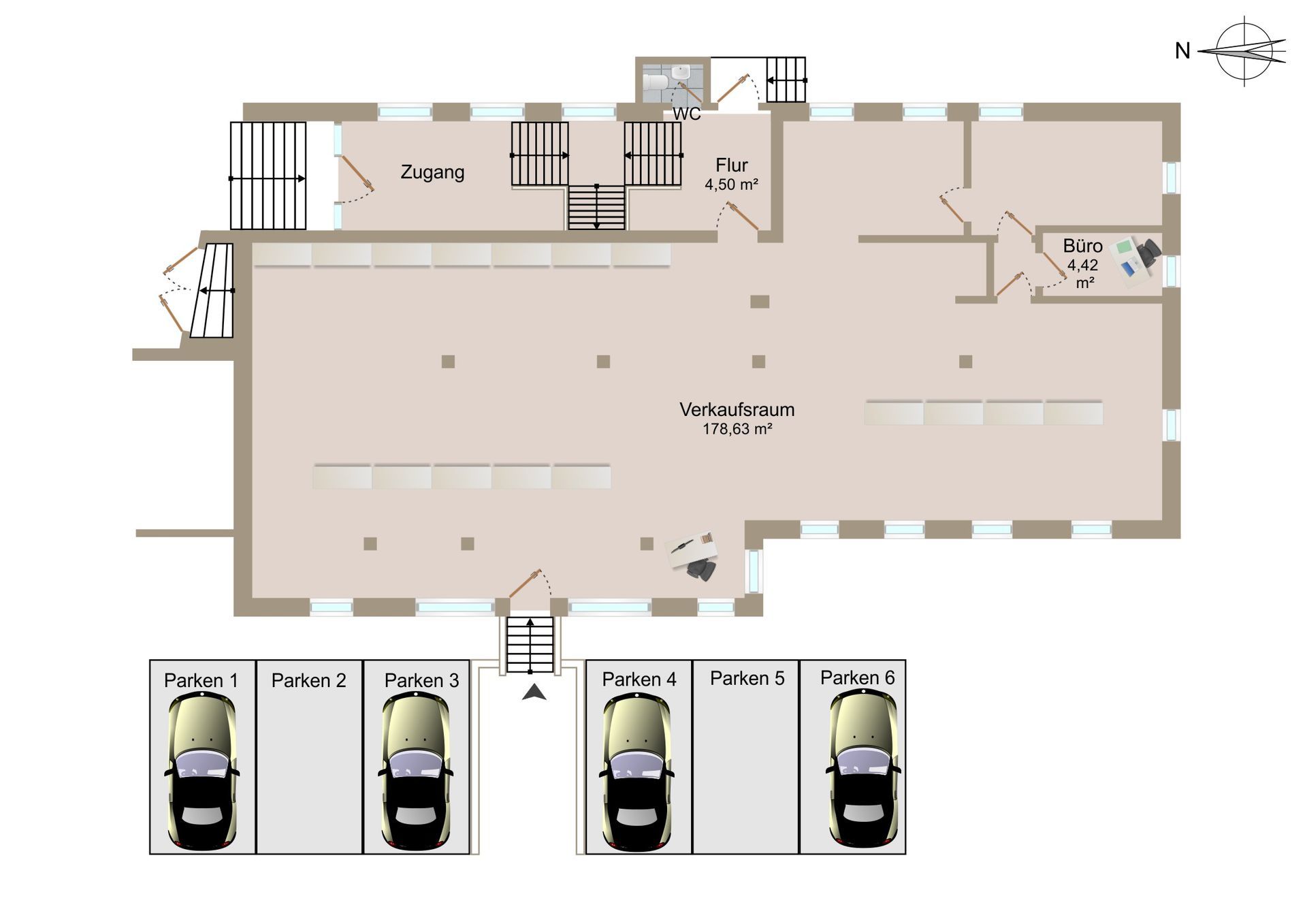 Ergänzt wird die Fläche durch separate Büro- oder Lagerräume, ein WC sowie einen praktischen Hintereingang an der Rückseite des Gebäudes, der den Waren- und Lieferverkehr erleichtert.