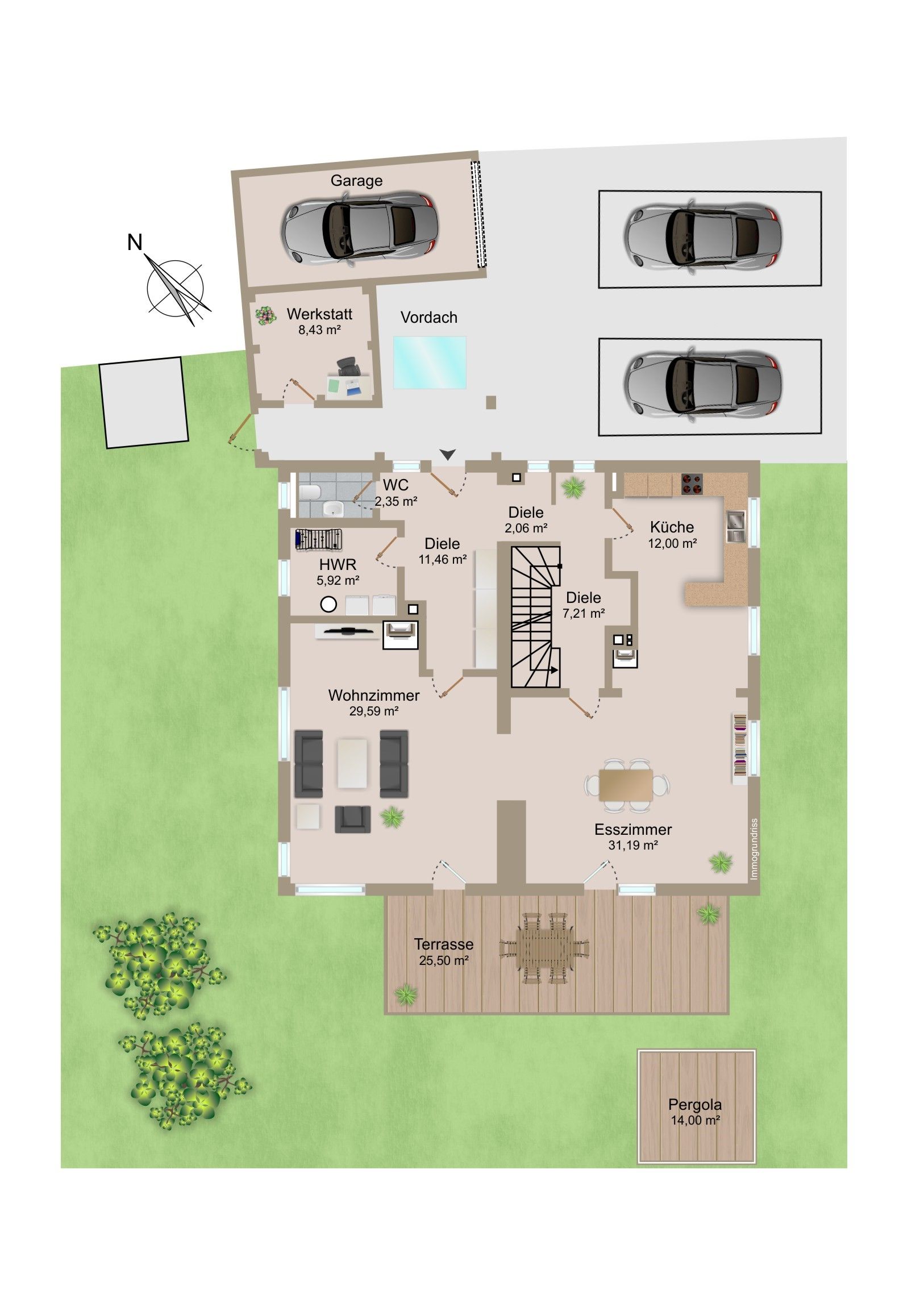 Der einladende Eingangsbereich führt in eine geräumige Diele, die ausreichend Platz für Garderobe und Schuhe bietet. Ein Gäste-WC befindet sich gleich neben der Eingangstür. Das Erdgeschoss besticht des weiteren durch das großes Wohnzimmer mit stilvollem Specksteinofen, der für gemütliche Stunden sorgt. Eine große Eck-Fensterfront und eine Terrassentür bieten einen herrlichen Blick in den Garten und Zugang zur sonnigen, nach Süd-Westen ausgerichteten Terrasse, die mit zwei elektrischen Markisen und einem überdachten Freisitz ausgestattet ist.