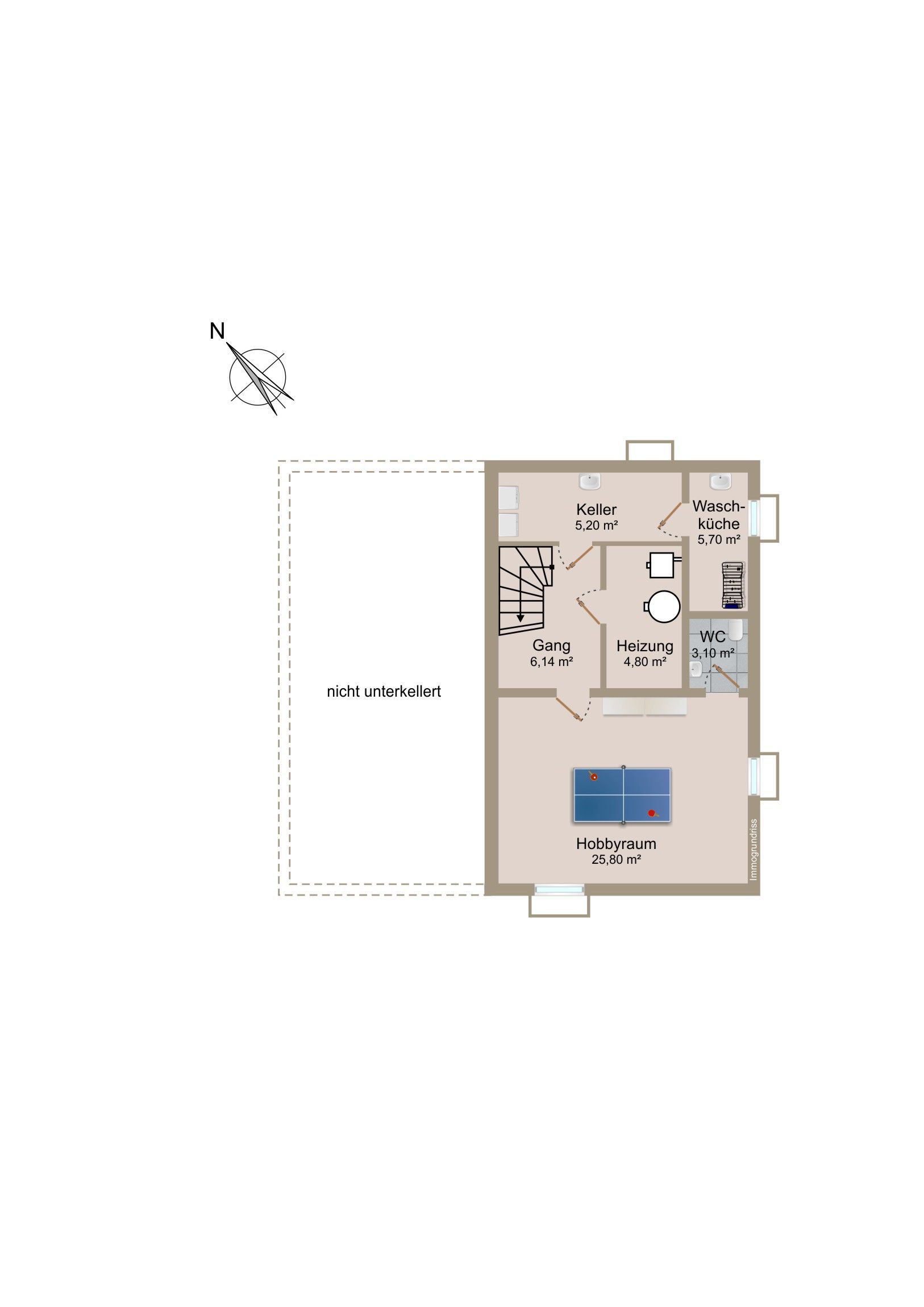Das Untergeschoss umfasst einen großzügigen Hobbyraum, der derzeit als Gästezimmer genutzt wird und über ein separates en-Suite-WC verfügt. Zudem finden Sie dort einen Heizungsraum mit der modernen Gas-Heizungsanlage (2021, Energieeffizienzklasse B), einen Kellerraum sowie eine Waschküche. Eine Solarthermie-Anlage zur Erwärmung des Brauchwassers sorgt für zusätzliche Energieeffizienz.